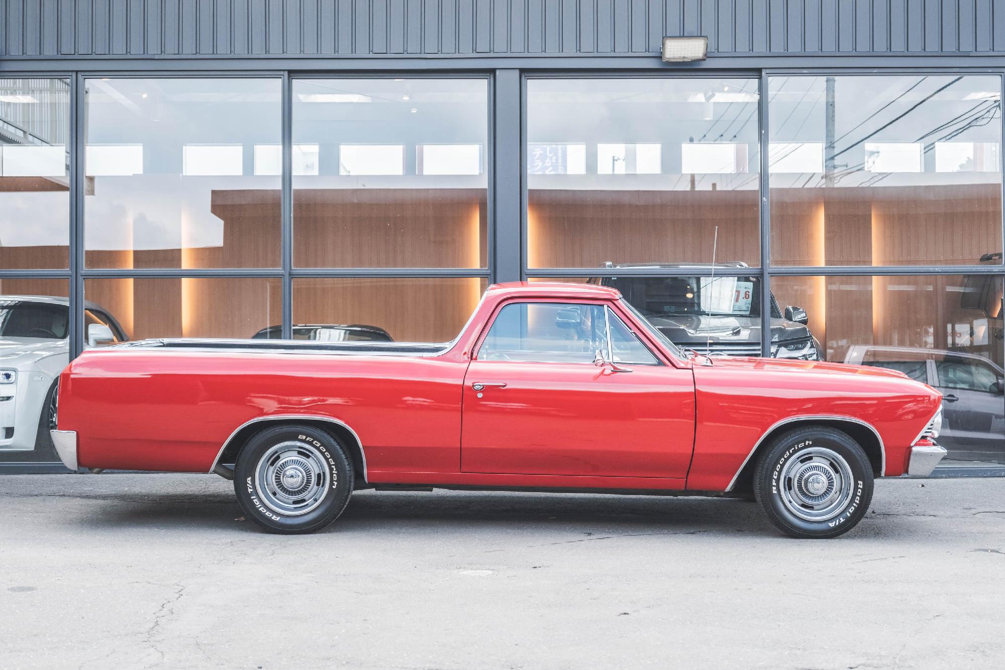 | 詳細情報 | ・エーデルブロックキャブレーター ・エーデルブロックヘッドカバー ・BFGoodrich ホワイトレター ・電圧計 ・水温計(華氏) ・油圧計 ・後付けクーラー ・ベッドライナー これぞアメ車と感じる方も多いのではないでしょうか。 今回の1966年式エルカミーノはモデルとしては2代目、シボレーシェベルをベースにピックアップトラック化しています。 1965年からスモールブロックの327ci(5400cc)エンジンを搭載し、396ci(6500cc)のビッグブロックエンジン搭載車も存在しています。 年式は違えどブレイキング・バッドシリーズやエネミー・オブ・アメリカなどハリウッド映画にもエルカミーノは登場します。 それだけ人気のあるモデルで、乗れば少しだけかもしれませんがハリウッド俳優の気分が味わえるかもしれません。 元々エルカミーノはインパラをベースに初代が製作されたため大柄なイメージがありますが、2台目はシボレーシェベルがベースになっているため、ボディサイズ自体は日本国内でも常識的なサイズです。 駐車場などにも神経質になる必要があまりなく、初めての旧アメ車としてもオススメできる1台です。 2人乗り、リクライニング無しのためその点は割り切る必要がありますが、クーペをぶった切ってトラックにしてしまう、まさにアメリカンな発想の元生まれたエルカミーノ、チャレンジしたい方は是非ご相談くださいませ。 |